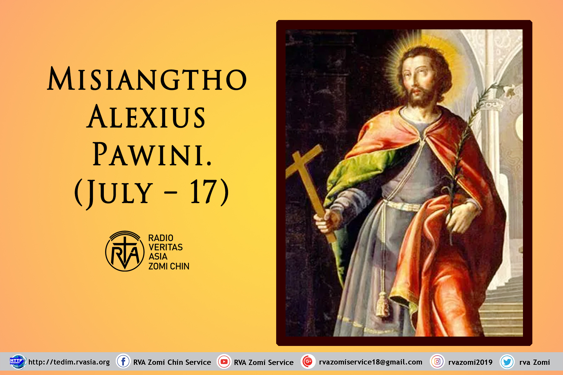 AD 412 kumin Italy gam, Rome ah Alexius si hi. Alexius pen gilkialna leh mite’ thupi simlohna hangin a si hi a, amah a sih ciangin ama kiang pan lai khat ki mu hi. A nu le pa te in tua lai a et uh ciangin a tapa uh ahih lam thei pan uh hi. Misiangtho Alexius pen khutdawhngente a huh Misiangtho hi.