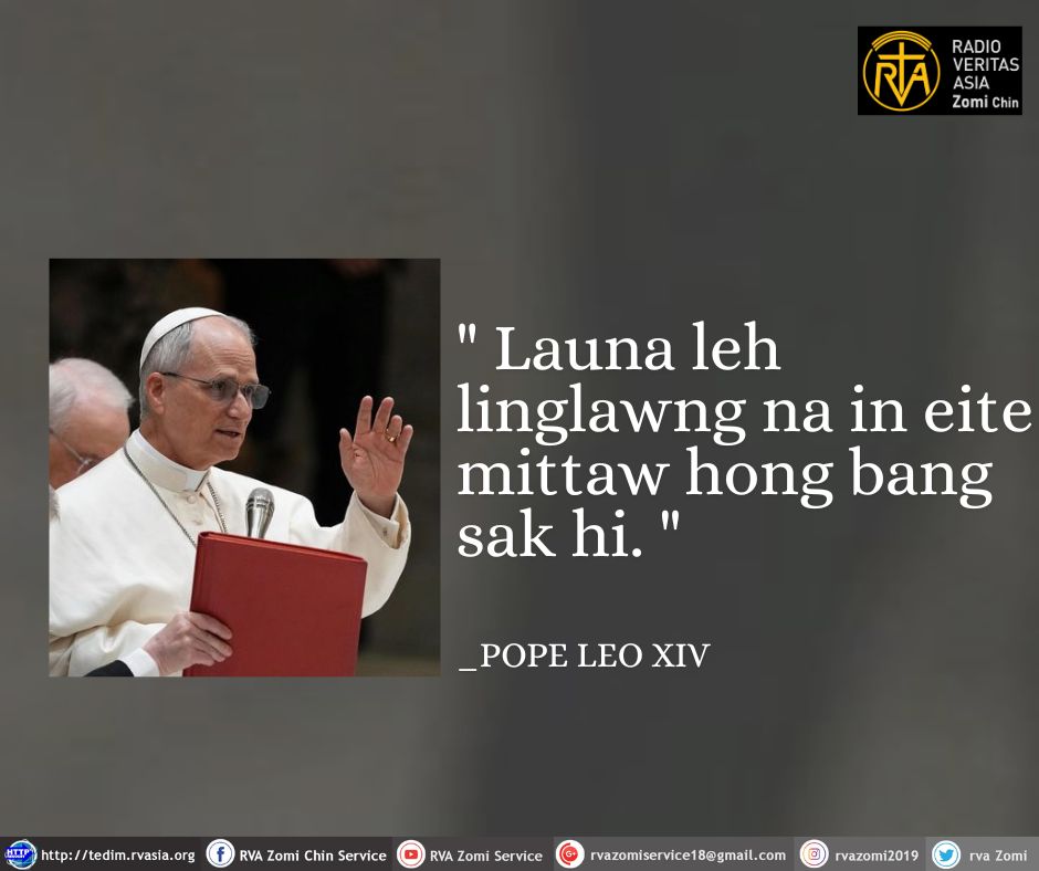 POPE LEO XIVFr.Joseph MungJanuary 23, 2026POPE KAMMAL POPE LEO XIV Kammal********” Launa leh linglawng na in eite mittaw hong bang sak hi. “ Tags# #KalayDiocese# #PopeKammal# #RVA# #RVATedimChinService# #RVAZomiChinService Fr.Joseph Mung Articles: 1675 Previous Post Catholic Nisim Lungdamna Laisiangtho. Hun Nautang Nipi Kaal (2) Na. 23.1.2026 (Fri) Next Post Hun Nautang Sung Nipi Kaal (2) Na (23.1.2026) Friday.