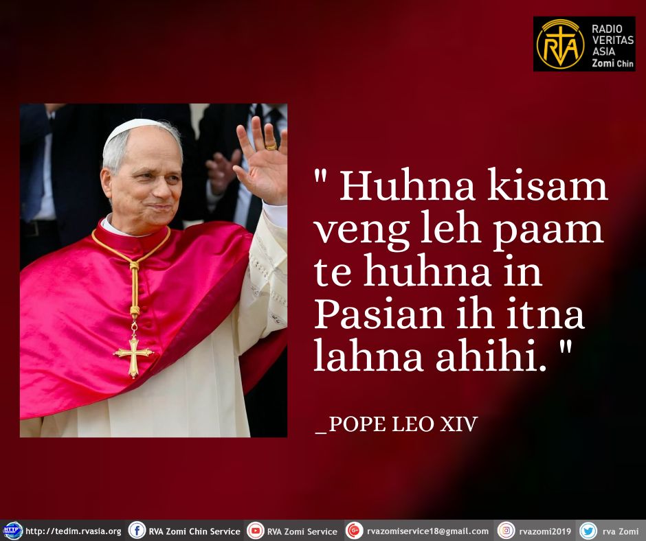 POPE LEO XIV KammalFr.Joseph MungFebruary 10, 2026POPE KAMMAL POPE LEO XIV Kammal********” Huhna kisam veng leh paam te huhna in Pasian ih itna lahna ahihi. Tags# #PopeKammal# #RVA# #RVATedimChinService# #RVAZomiChinService Fr.Joseph Mung Articles: 1675 Previous Post Mass on the Second Day of Annual Retreat with Rev. Fr. John Aye Kyaw (10.2.2026) Next Post Hun nautang sung ah Nipi (5) na, Catholic Nisim lungdamna Laisiangtho 10.02.2026 (Tuesday)